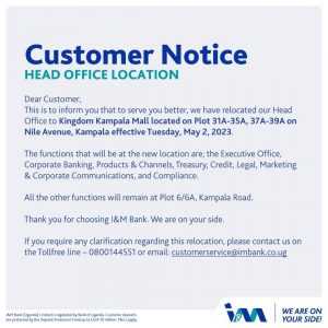 “Dear customers, this is to inform you that to serve you better, we have relocated our head offices to Kingdom Kampala Mall located on plot 13A-35A, 37A-39A on Nile Avenue, effective Tuesday, May 2, 2023,” reads the notice in part.