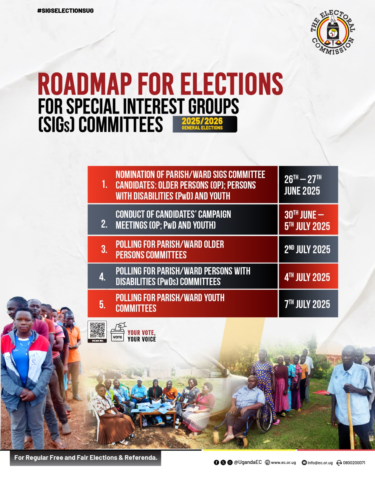 The Electoral Commission has launched the Parish and Ward level elections for Special Interest Groups (SIGs) across Uganda. These elections are a key part of the 2025–2026 General Elections Roadmap and focus on choosing leaders for Older Persons, Persons with Disabilities (PWDs), and the Youth.
