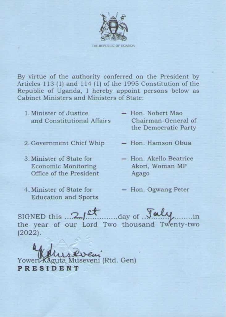 “By virtue of the authority conferred on the President by Articles 113(1) and 114 (1) of the 1995 constitution of the Republic of Uganda, I hereby appoint persons below as Cabinet Ministers and Ministers of State”President Museveni tweeted.