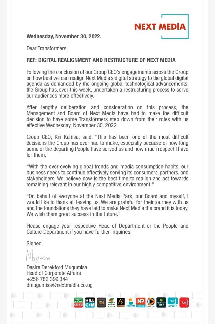 At least 30 employees at Kin Kariisa’s Next Media have lost their jobs in a broader digital realignment of the company aimed at creating efficiency.Next Media,the holding company for a string of media brands NBS TV,Next Radio,Sanyuka TV,Salaam TV and Nile Post among others employees slightly above 500 workers across its platforms.