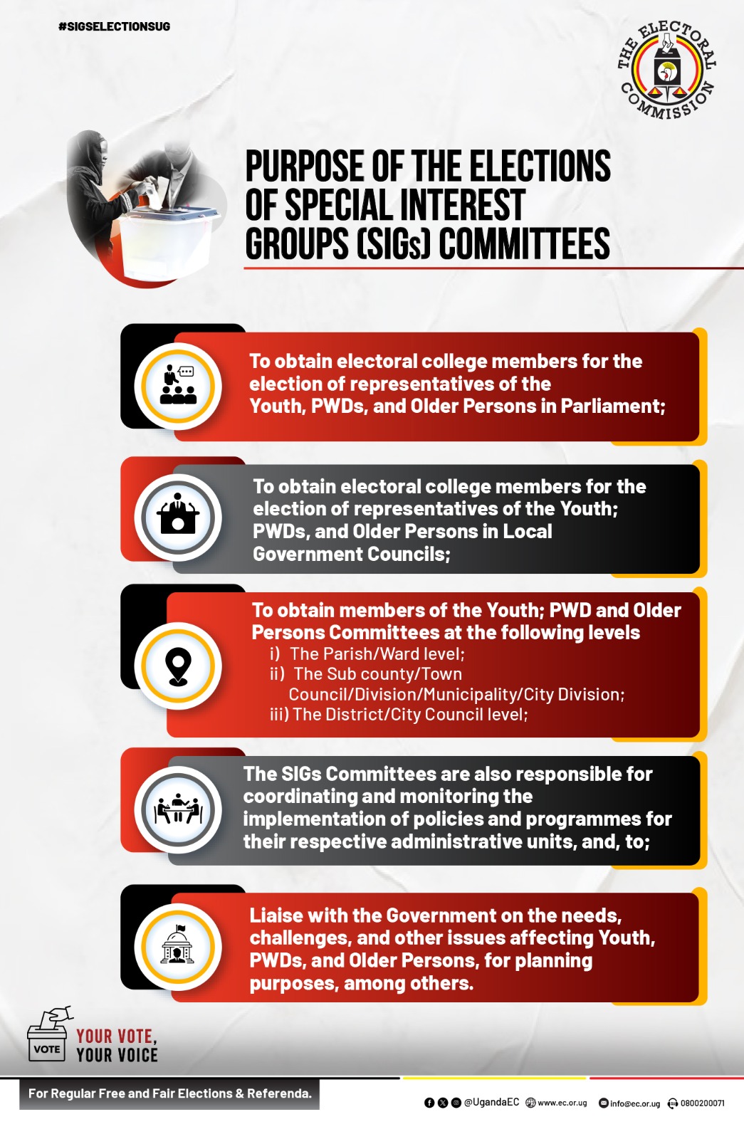 The SIGs elections also help form electoral colleges that choose representatives at local government levels bringing the voice of special interest groups to the very communities where they live and work. From villages to cities, the elected leaders will represent and defend the rights of their groups.